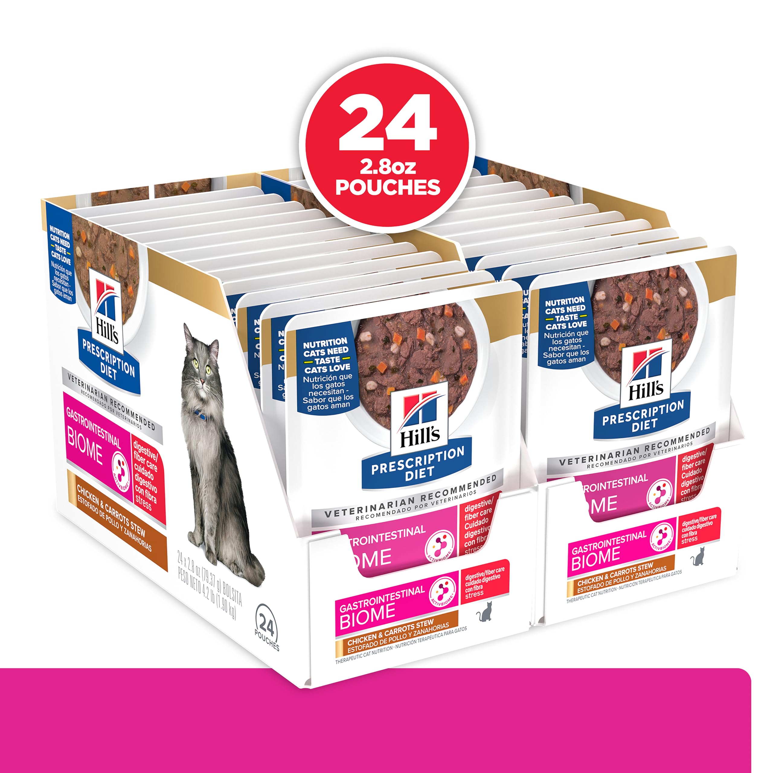 Hill's Prescription Diet Gastrointestinal Biome + Stress Digestive/Fiber Care Wet Cat Food, Chicken & Carrot Stew, 2.8 oz. Pouches, 24-Pack—