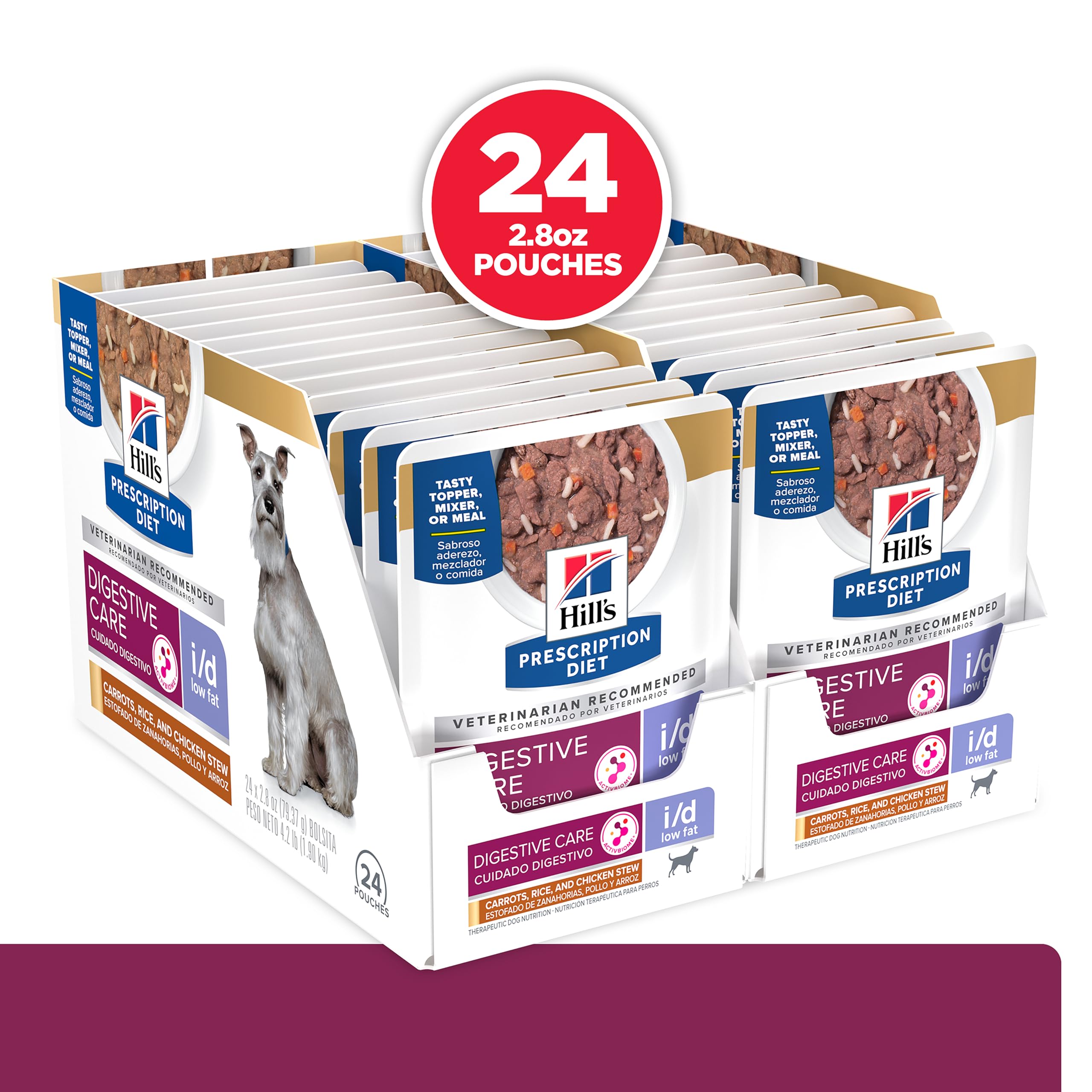- Hill's Prescription Diet i/d Low Fat Digestive Care Carrots, Chicken and Rice Stew Pouch Dog Food is specially formulated by Hill’s nutritionists and veterinarians to support dogs' digestive health.